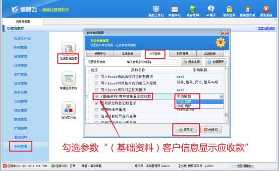 在進銷存軟件里,客戶信息管理至關重要,它能幫助我們維護客戶的基礎資料,為后續的業務開展提供有力支撐。不過,部分用戶反饋,希望能直接在客戶信息界面查看應收款情況,這樣操作起來更便捷高效。下面就為大家詳細介紹具體的設置方法,簡單易懂,幾步就能搞定! 三步開啟智能應收管理,告別繁瑣操作! 一鍵配置,靈活刷新 在功能導航欄點擊“系統管理”—“系統參數配置”,點擊“業務參數”,在“特殊功能參數”中勾選“(基礎資料