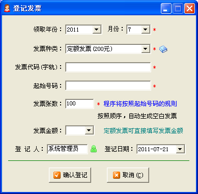 銷項發票目前主要分為定額發票、增值稅發票、一般機打發票三種,公司會計人員在稅局購領后,需要在第一時間內,在《紅管家財務出納記賬系統》中進行登記。主要登記信息包括: