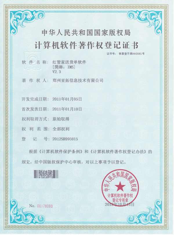 日前,亞拓軟件開發的一款送貨單打印軟件——《紅管家送貨單軟件》的最新版本,再次獲得國家版權中心軟件著作權證書(登記號:2012SR095915),您可在國家版權登記中心網站的版權數據庫中進行查詢。獲得著作權認證標志著這款軟件產品得到了國家級認可,軟件的質量具有一定的保證,同時軟件的版權也獲得了法律保障!