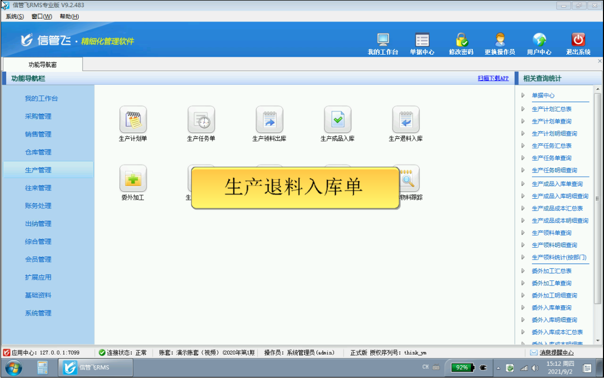 介紹信管飛RMS生產退料入庫單的主要功能和操作步驟。