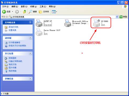 (3)、安裝好驅(qū)動(dòng)程序后,在“控制面板”的“打印機(jī)和傳真”中,會(huì)多出來一個(gè)名為“SC-5890”的打印機(jī),如下圖所示: