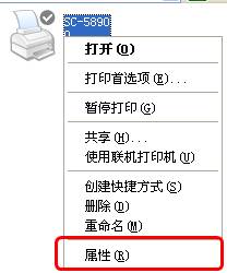 在“打印機(jī)和傳真”中,選中“SC-5890”,點(diǎn)擊鼠標(biāo)右鍵,在右鍵菜單中點(diǎn)“屬性”,如下圖所示: