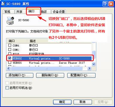 在彈出的屬性窗口,點(diǎn)擊“端口”標(biāo)簽頁,選擇相應(yīng)的USB打印端口,如下圖,我們選擇USB002打勾,這是一個(gè)虛擬打印USB端口(Virtual Printer Port For USB),一般大家的機(jī)器如果只有一個(gè)USB口的打印機(jī),則選擇USB001即可。