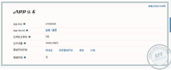 (3)進入應用基本信息頁面,如下圖所示,下圖中的AppKey 和 App Secret需要在紅管家網店管理軟件中要使用。