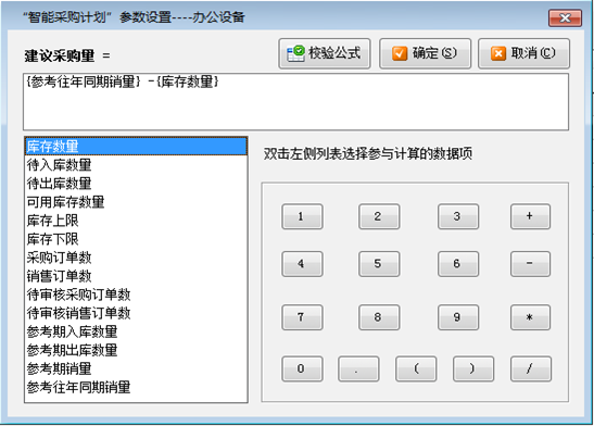 (1)參數(shù)設(shè)置:可以設(shè)置“建議采購量”的運算公式,軟件將根據(jù)您設(shè)計的公式計算出建議數(shù)量,如下圖2所示。
