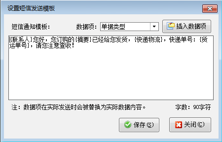 短信模板我們自己可以設置的,你可以選中你需要的數據項插入到短信模板中,這樣軟件會自動調取單據中相應的數據項,我們在給客戶發送短信時就會提取為實際數據。