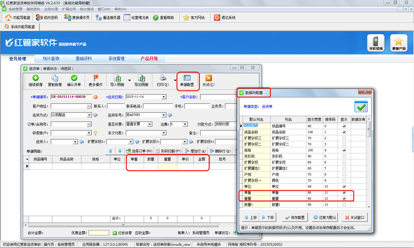 另外在開單頁面點(diǎn)“單據(jù)配置”,會(huì)彈出數(shù)據(jù)列配置界面,在數(shù)據(jù)列配置頁面中將“單重”、“重量”打勾顯示出來,下圖以新開送貨單界面為例截圖說明。