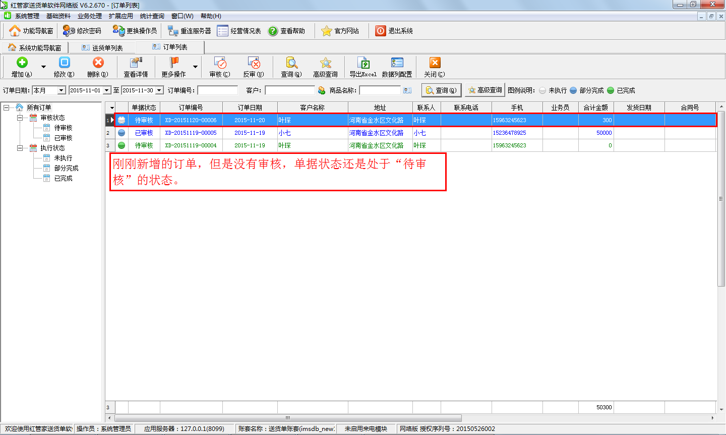一、新增訂單之后,訂單未審核,還是處于“待審核”的狀態(tài),此種情況下新開送貨單時是無法引用此訂單的,系統(tǒng)會提示“您選擇的訂單處于‘待審核’狀態(tài),請先在訂單列表中審核訂單!”,如下圖所示。