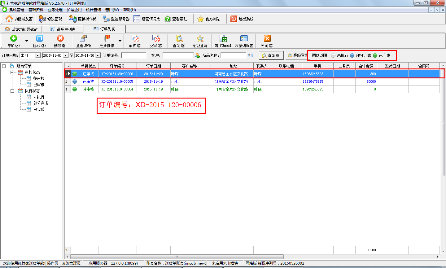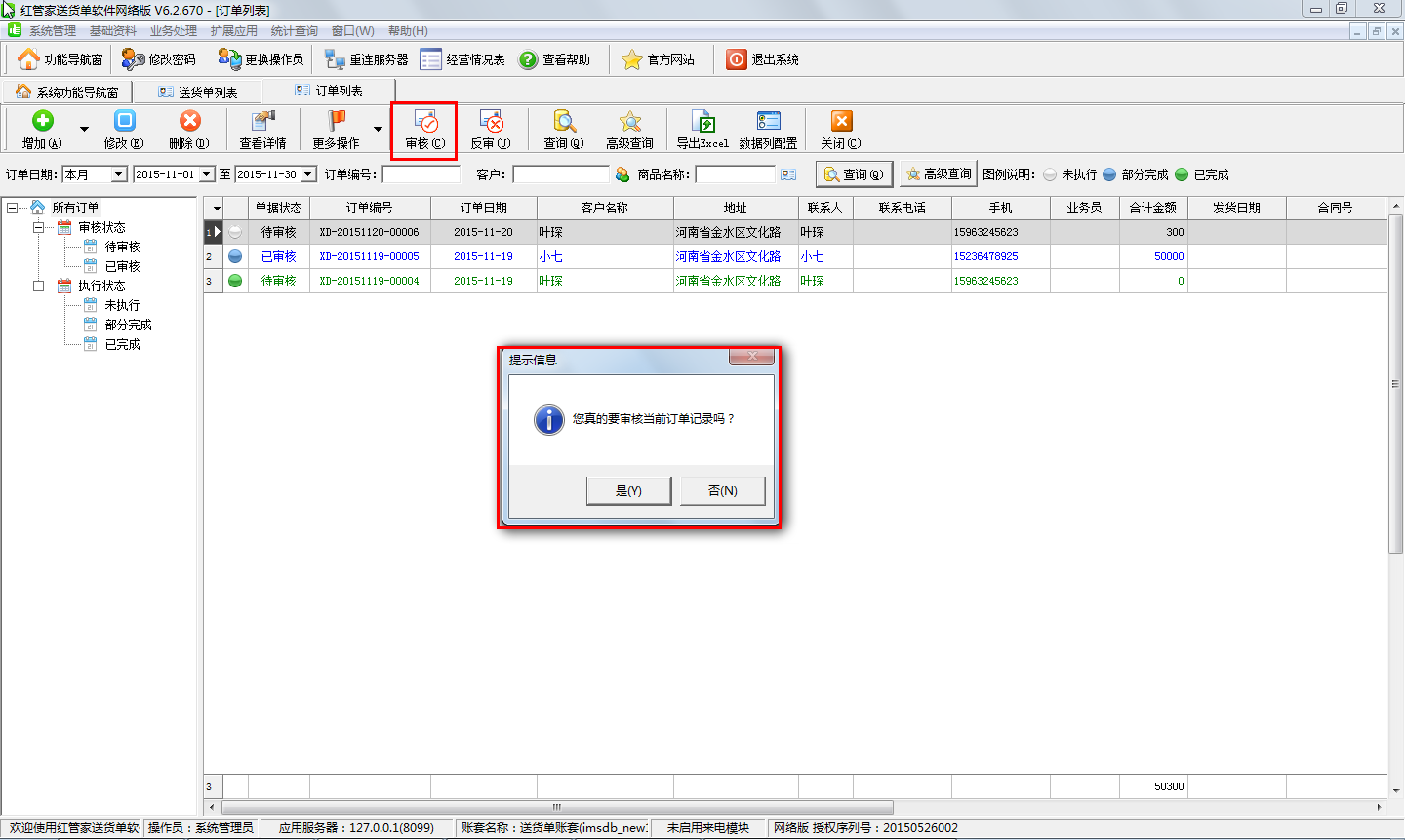 此種情況下需要在功能導航窗中點擊“業(yè)務處理”—》“訂單列表”,在訂單列表中找到此前新增的訂單點擊“審核”按鈕進行審核操作,如下圖所示。