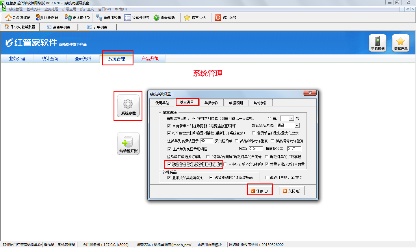 由于系統(tǒng)默認在送貨單開單時是不允許選擇未審核的訂單的,因此訂單審核之后,新開送貨單時再次引用訂單時就可以引用成功了。如果用戶在新開送貨單時想直接引用“待審核”狀態(tài)的訂單時,可以在功能導航窗中點擊“系統(tǒng)管理”—》“系統(tǒng)參數”—》“基本設置”中,打勾選中“送貨單開單允許選擇未審核訂單”選項啟用送貨單開單允許選擇未審核訂單的功能,配置完之后點擊“保存”按鈕,之后在新開送貨單時就可以直接引用“待審核”狀態(tài)的訂單了,如下圖所示。