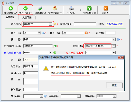 1、日記賬憑證上面的“發生日期”不能小于資金賬戶當前賬期的起始日期。做日記賬憑證時填寫的“發生日期”小于該資金賬戶的賬期起始日期,系統會彈出無法保證該憑證的提示信息,如圖2所示。