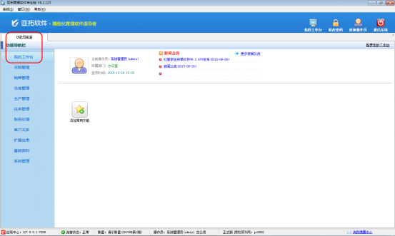 亞拓軟件開發的亞拓管理軟件、亞拓倉庫管理軟件、紅管家票據打印軟件等都包含我的工作臺功能,我的工作臺中可以查看當前操作員信息、最新的通知公告、業務提醒信息,并且可以添加一些常用的功能模塊。下面我們以亞拓管理軟件專業版為例詳細介紹下我的工作臺功能是如何使用的。