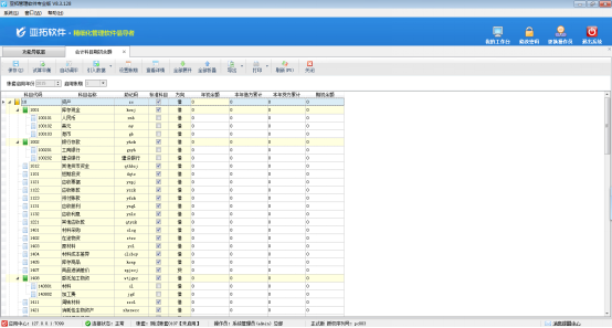 會計科目是填制會計憑證、登記會計賬簿、編制會計報表的基礎,亞拓管理軟件專業版包括財務管理等功能,支持會計科目維護(亞拓管理軟件星光版和標準版不支持),亞拓管理軟件專業版中的會計科目預置的為2013小企業會計準則中要求的會計科目。系統將會計科目分為資產類、負債類、權益類、成本類、損益類(不支持“共同類”科目)。