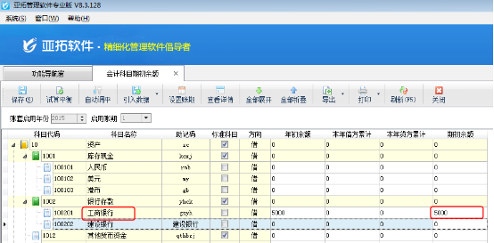 登錄亞拓管理軟件專業版,點“基礎資料”—》“期初建賬”,然后點“期初科目余額”功能按鈕,進入“會計科目期初余額”錄入界面,如圖2所示,可以錄入每個會計科目的年初余額,以及本年的累計借方和貸方(不是從1月份開始啟用賬套時需錄入)。
