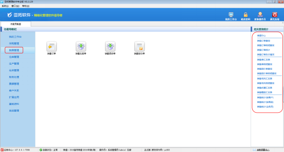 亞拓管理軟件中包括各種業(yè)務(wù)查詢和統(tǒng)計(jì),在功能導(dǎo)航窗右側(cè)“相關(guān)查詢統(tǒng)計(jì)”中點(diǎn)擊相應(yīng)的統(tǒng)計(jì)查詢項(xiàng)目,即可查詢和統(tǒng)計(jì)相應(yīng)的數(shù)據(jù)。以圖1為例,點(diǎn)擊功能導(dǎo)航窗的“銷售管理”,在功能導(dǎo)航窗右側(cè)“相關(guān)查詢統(tǒng)計(jì)”中,可以看到銷售模塊的相關(guān)統(tǒng)計(jì)查詢項(xiàng)目。