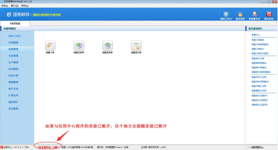 亞拓管理軟件紅管家倉庫管理軟件紅管家票據打印軟件都包括客戶端程序和應用中心程序兩個模塊,客戶端程序登錄系統時,應用中心程序是必須打開的。如果主機電腦(網絡版用戶插入加密鎖的電腦為主機電腦)關機或關閉應用中心程序、程序出現異常等,客戶端程序與應用中心的連接就會斷開。應用中心程序再次正常運行后,客戶端程序需要重新建立與應用中心程序的連接。下面我們以亞拓管理軟件專業版為例介紹一下客戶端程序重連應用中心程序的操作。