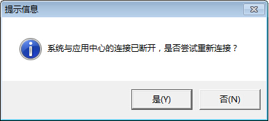 第一種解決方式:鼠標雙擊軟件界面最下方的“連接狀態:已斷開”字樣,系統會彈出“系統與應用中心的連接已斷開,是否嘗試重新連接?”提示信息,如圖2所示,點“是”按鈕,客戶端程序會嘗試重新建立與應用中心程序的連接。如果連接成功即可打開相應的功能,繼續使用軟件