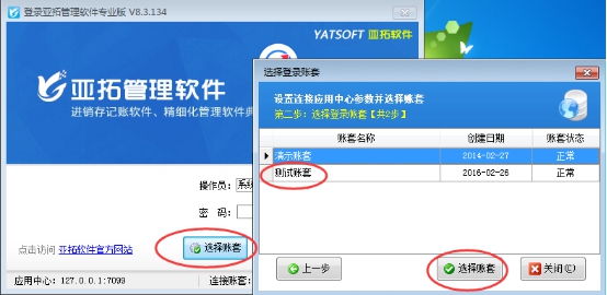 運行亞拓管理軟件客戶端(藍色圖標),在軟件登錄界面點擊“選擇賬套”,在“選擇登錄賬套”界面選擇我們所需要的賬套,然后登錄軟件即可。