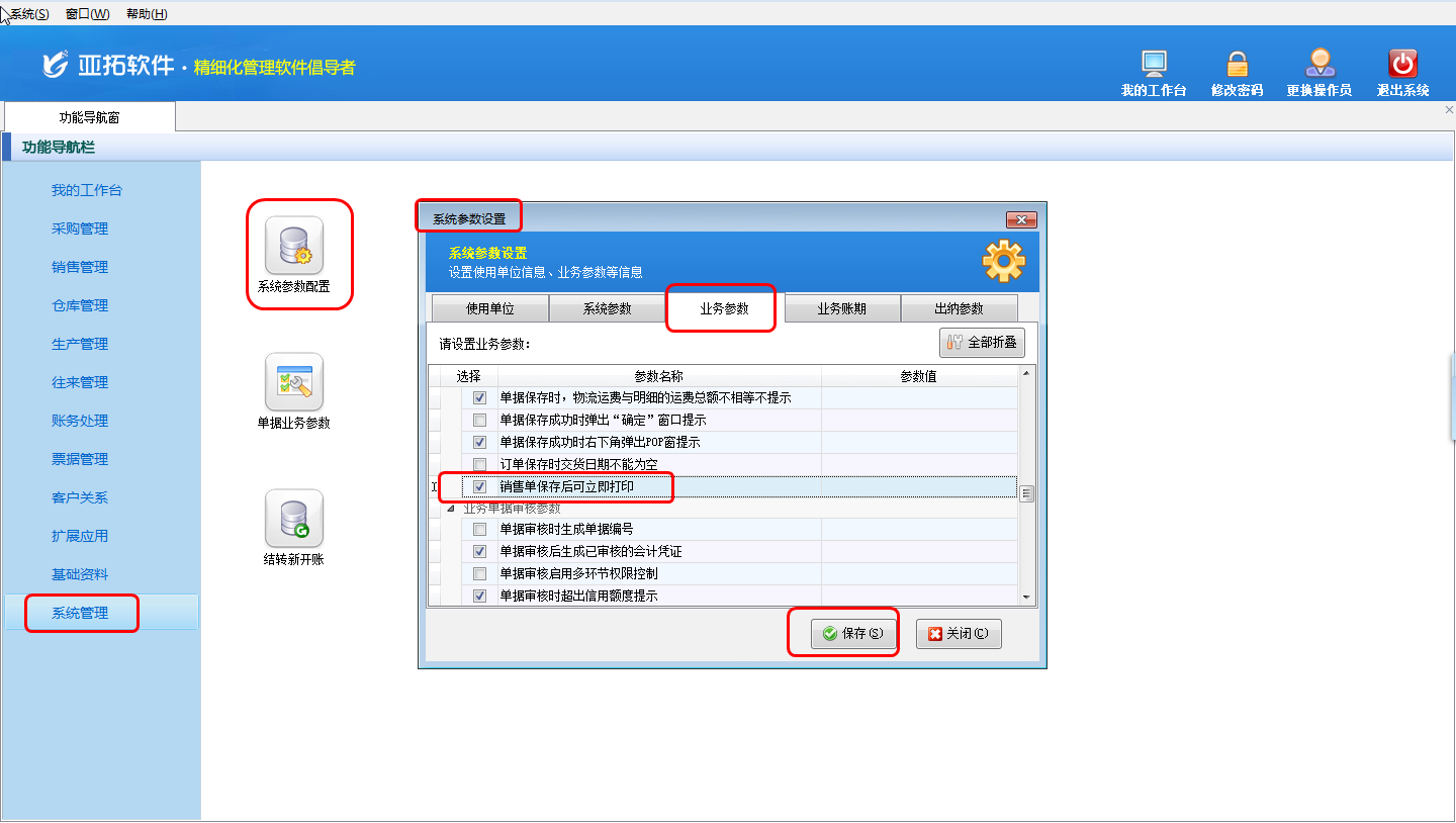 在功能導航窗點擊“系統(tǒng)管理”——》“系統(tǒng)參數配置”打開系統(tǒng)參數配置界面,在“系統(tǒng)參數設置”——》“業(yè)務參數”——》“業(yè)務單據保存參數”中打勾選中“銷售單保存后可立即打印”選項啟用“銷售單保存后可立即打印”此功能,配置完之后點擊“保存”按鈕保存設置即可,如下圖所示。