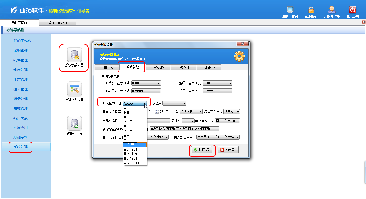 在功能導航窗點擊“系統管理”——“系統參數配置”——“系統參數”,在“系統參數”界面可以修改“默認查詢日期”(這里修改為“最近7天”),修改完成之后點擊“保存”按鈕保存配置。