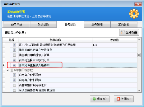 軟件中默認是允許開單時直接錄入新客戶/供應商的。如果該業(yè)務參數(shù)沒有被勾選,需要我們在使用此功能之前對相應的業(yè)務參數(shù)進行設置。在業(yè)務參數(shù)界面上我們將“開單允許直接錄入新客戶”勾選上,然后進行保存。