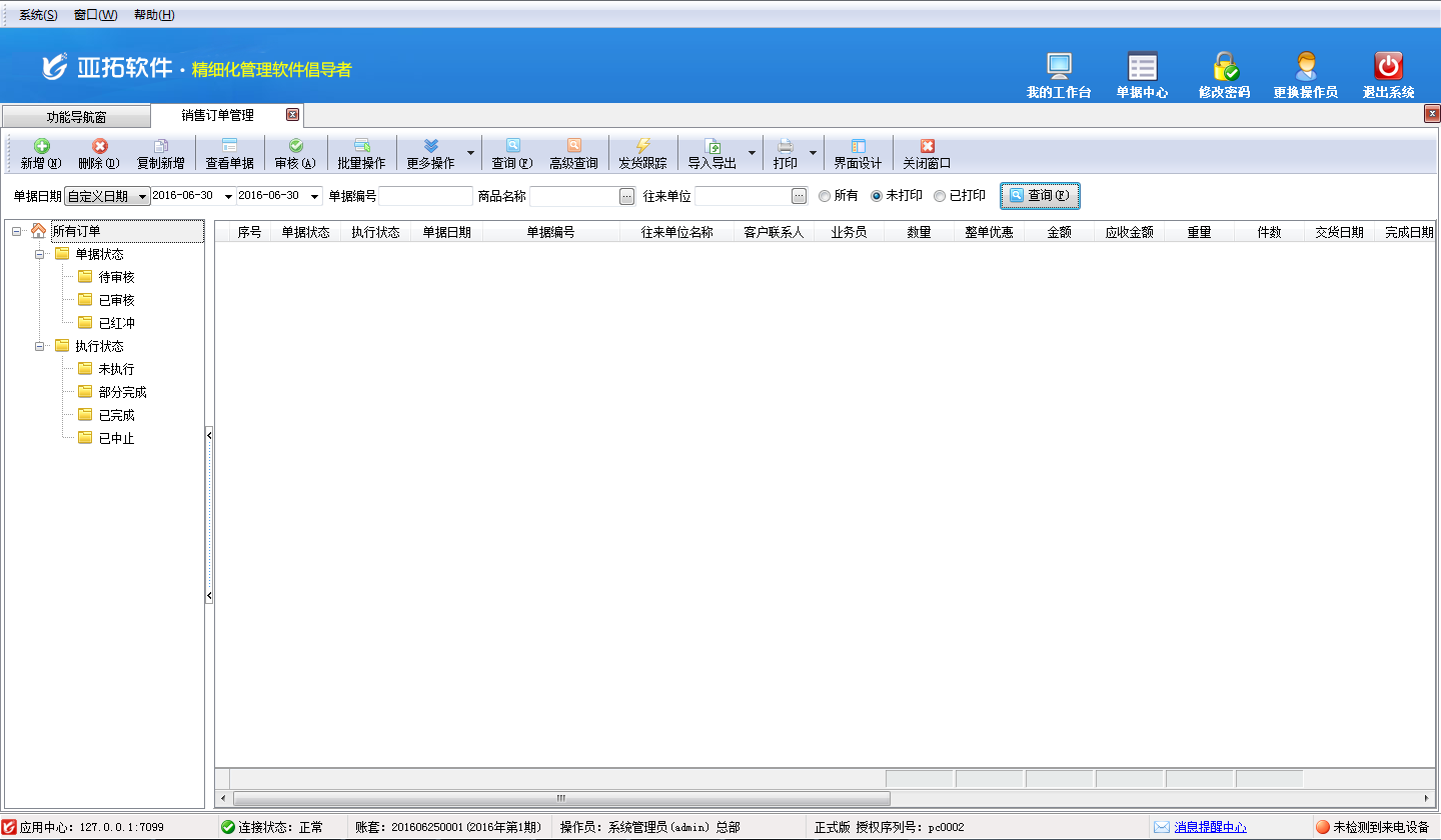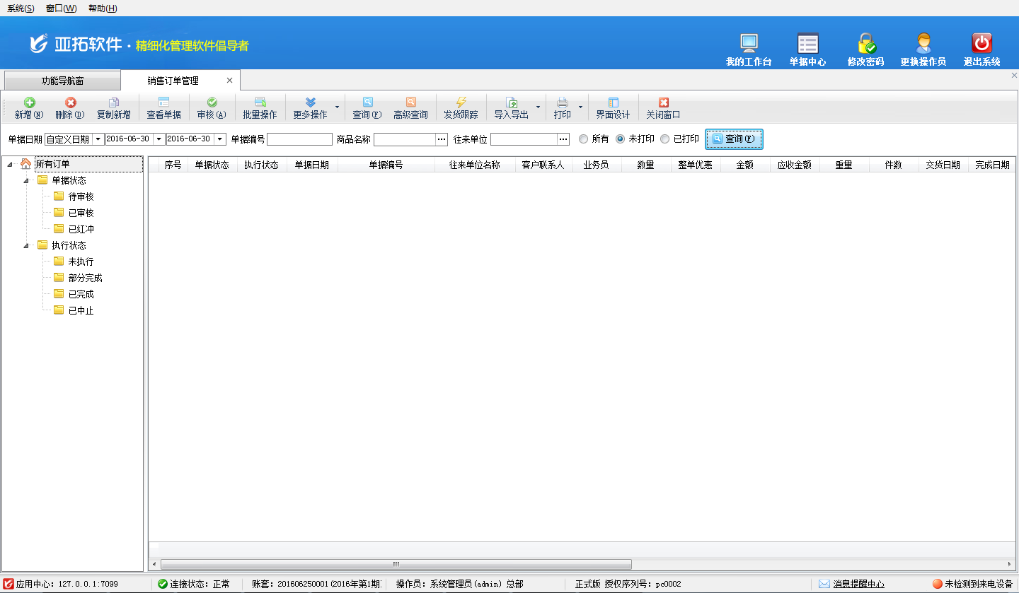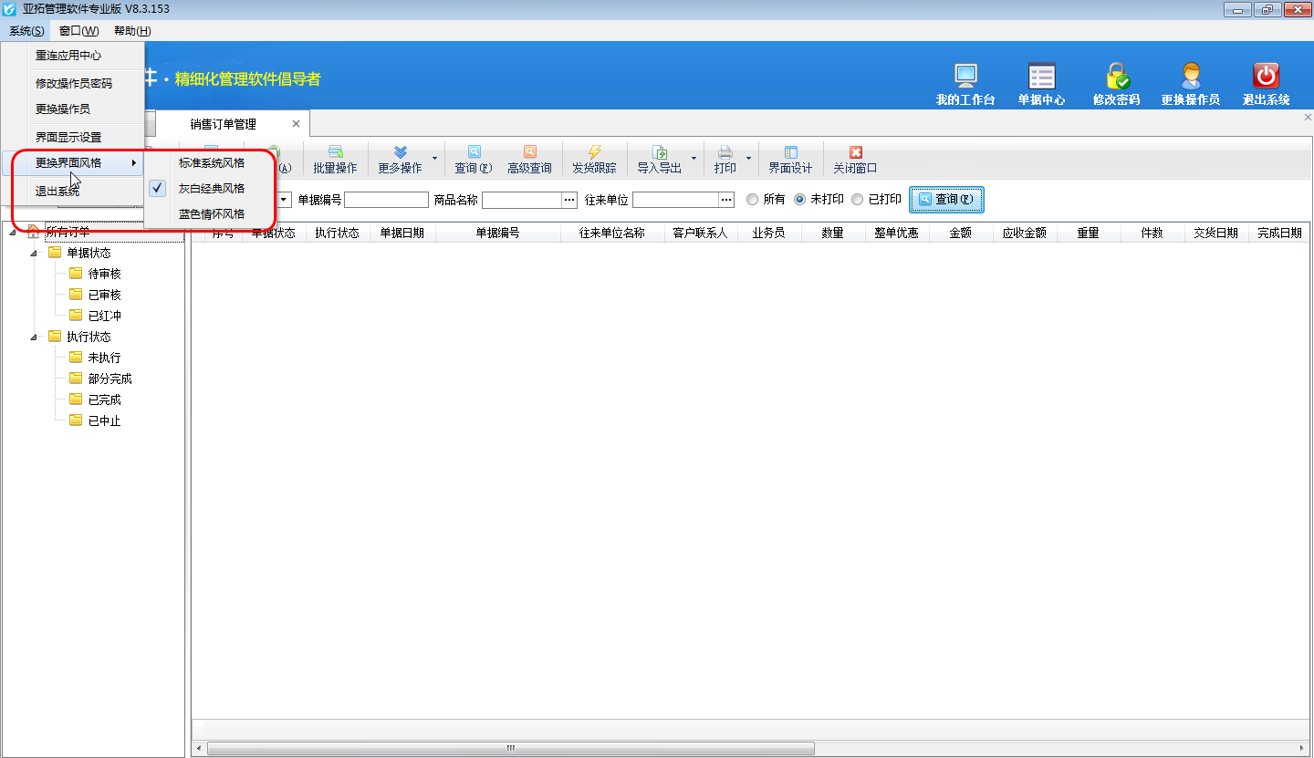 亞拓管理軟件內提供了3種不同的界面風格(標準系統風格灰白經典風格藍色情懷風格),軟件安裝后默認為“灰白經典風格”,如下圖所示。