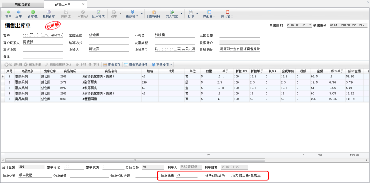 (4)僅登記運費:運費付款類別選擇“僅登記運費”時,保存并審核單據(jù)的時候,運費不會合計到“應(yīng)收金額”內(nèi),且不會生成“物流運費應(yīng)付款”,可以備注說明一下此單運費金額為多少。