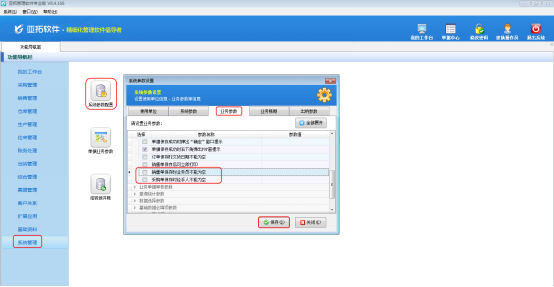 在功能導航窗中點擊“系統管理”—》“系統參數配置”,即可進入“系統參數設置”界面,點擊“業務參數”,如圖2所示,在業務單據保存參數內找到“銷售單保存時業務員不能為空”參數,把這個參數的勾選去掉,然后保存。