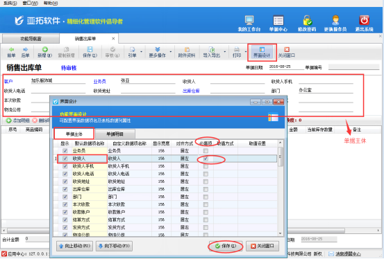 為了避免在開單的時候漏掉必須要填寫的信息,亞拓管理軟件、紅管家倉庫管理軟件紅管家送貨單軟件等支持設計單據主體必填項。下邊以亞拓管理軟件專業版“銷售出庫單”開單為例,設置單據主體必填項。