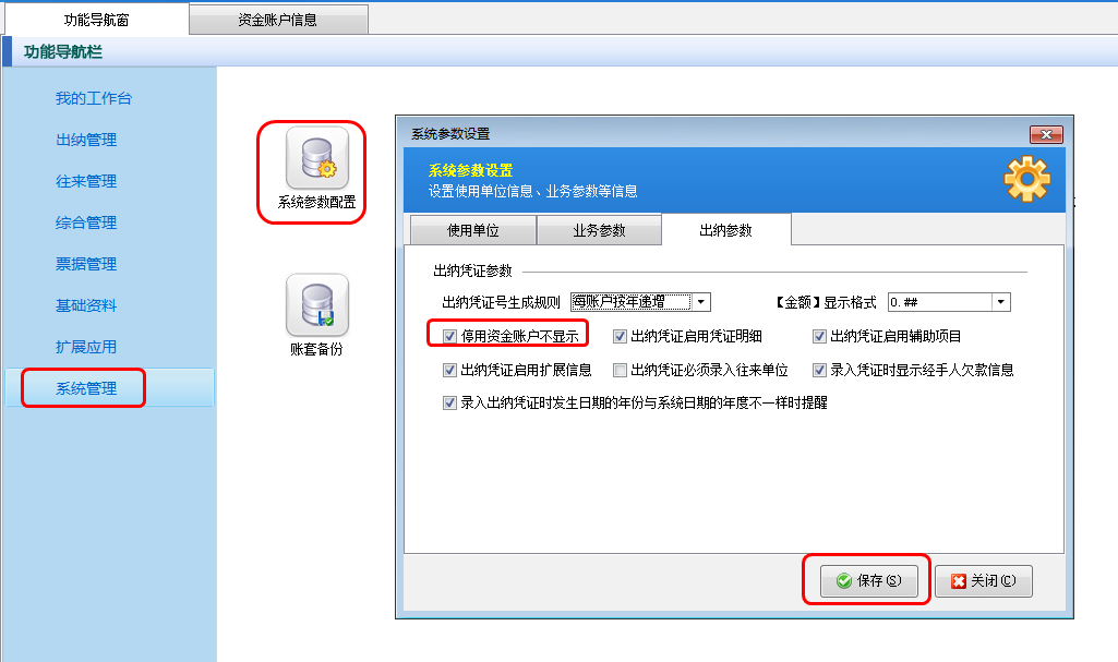在功能導航窗點擊“系統管理”——》“系統參數配置”——》“出納參數”內打勾啟用“停用資金賬戶不顯示”參數,然后點擊“保存”按鈕保存配置。