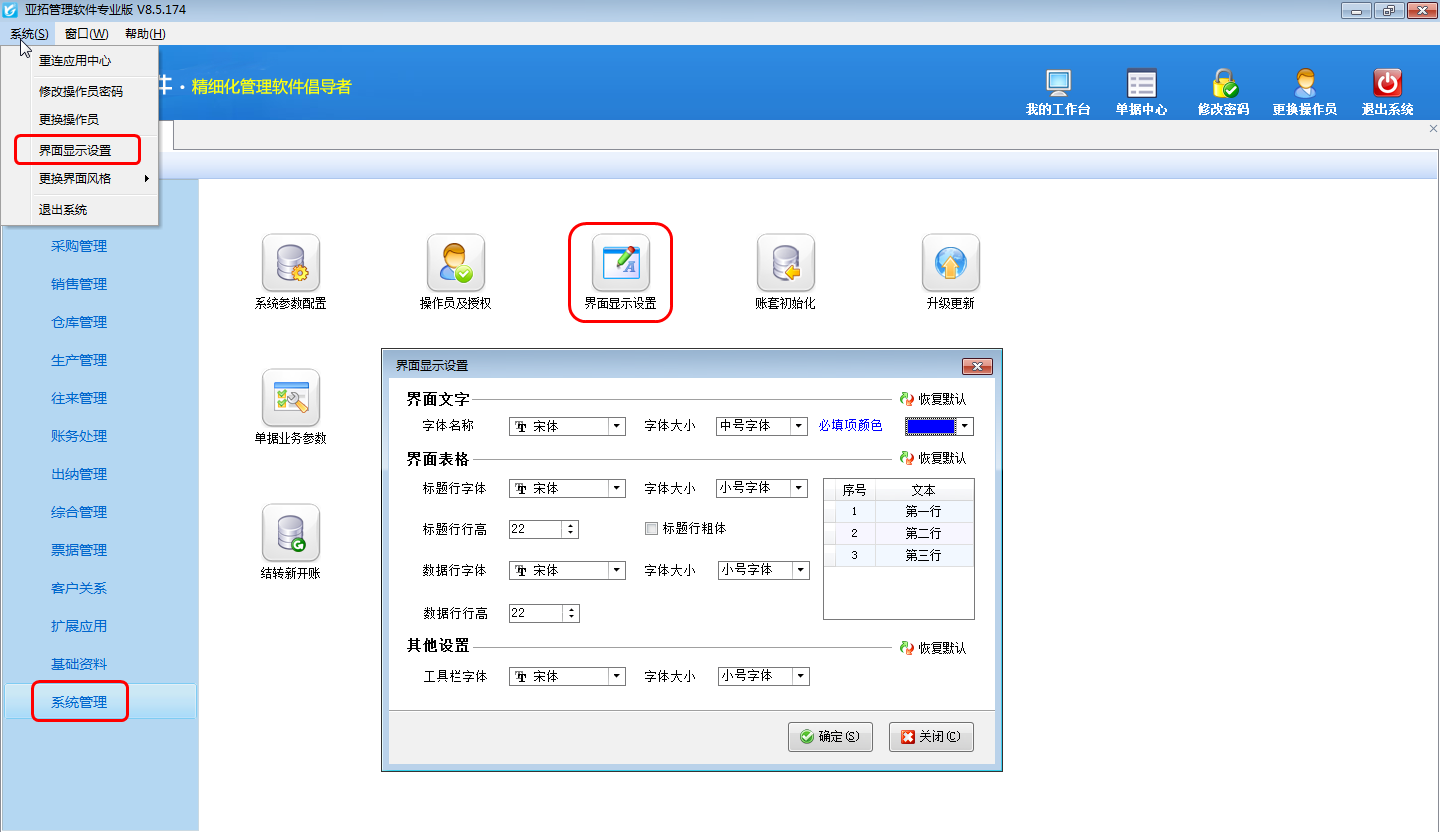 亞拓管理軟件精細化管理軟件進銷存管理軟件記賬軟件)、紅管家送貨單軟件紅管家倉庫管理軟件紅管家票據打印軟件紅管家出納記賬軟件中都可以對界面文字(界面文字僅對業務單據生效)以及界面表格字體大小進行設置,本篇文章以亞拓管理軟件專業版為例詳細介紹下在軟件內如何調整字體大小?