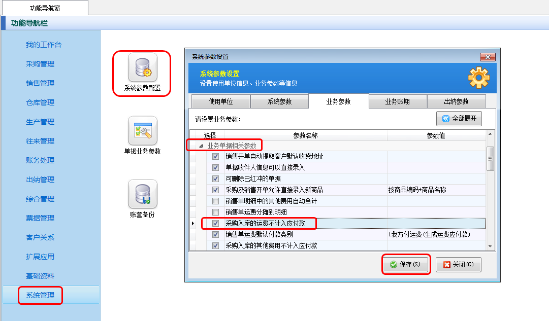 在功能導航窗點擊“系統管理”—》“系統參數配置”—》“業務參數”,即可進入到“業務參數”配置界面,在業務單據相關參數內打勾啟用“采購入庫的運費不計入應付款”參數,設置完成后點擊“保存”按鈕保存配置,如下圖一所示。