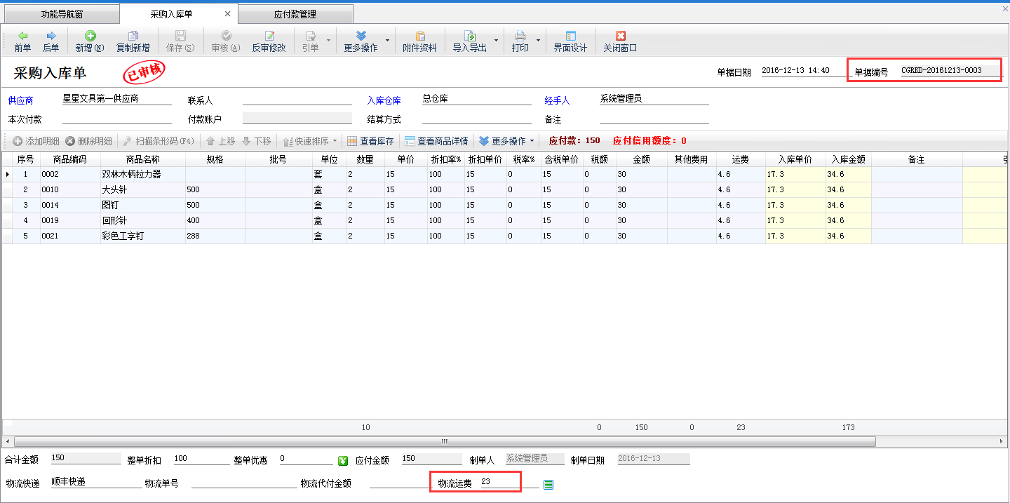 設置完成之后,我們在采購管理內新增采購入庫單,并錄入運費(注意:物流運費需要和明細內的運費總額相等才可以保存成功,不相等時單據不能保存),如下圖二所示。