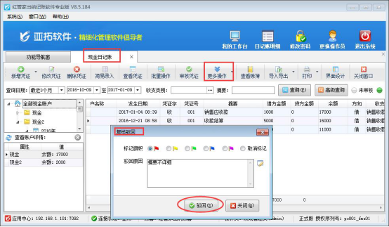 以出納記賬軟件專業(yè)版的現(xiàn)金日記賬為例,如何標(biāo)記駁回原因。打開(kāi)左側(cè)導(dǎo)航窗的“出納管理”,選擇“現(xiàn)金日記賬”中一個(gè)憑證(只有待審核的憑證才能被標(biāo)記),點(diǎn)擊工具欄中的“更多操作”下的符合駁回,可對(duì)有問(wèn)題的憑證標(biāo)記顏色和駁回原因,如下圖所示: