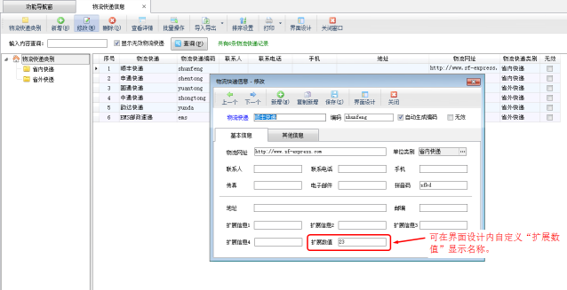 在功能導航窗點擊“基礎資料”—》“物流快遞”打開物流快遞信息界面,修改“順豐快遞”運費為23元(可將物流快遞運費維護在“擴展數(shù)值(數(shù)據(jù)項英文名稱:extnum1)”內(nèi)),如下圖一中所示。