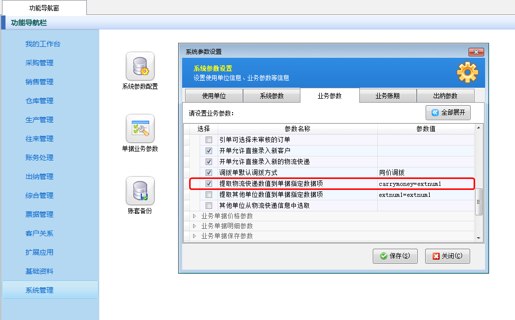 在功能導航窗點擊“系統(tǒng)管理”—》“系統(tǒng)參數(shù)設置”—》“業(yè)務參數(shù)”可以進入到“業(yè)務參數(shù)”配置界面,在業(yè)務單據(jù)相關參數(shù)內(nèi)打鉤啟用“提取物流快遞數(shù)值到單據(jù)指定數(shù)據(jù)項”參數(shù),并設置參數(shù)值(格式如:extnum1(提取到擴展數(shù)值1)、extnum1=extnum1(提取到擴展數(shù)值1)或carrymoney=extnum1(提取到運費字段)),默認為“carrymoney=extnum1(提取到運費字段)”,如下圖二中所示。