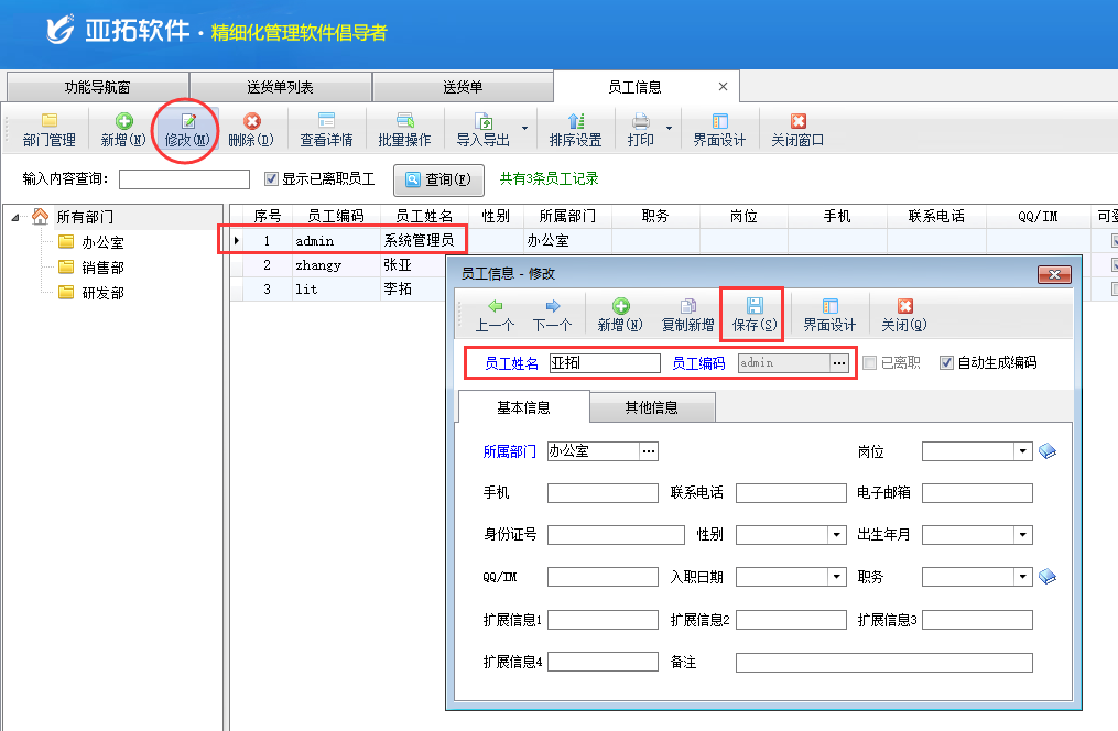 在功能導(dǎo)航窗點擊“基礎(chǔ)資料”——》“員工信息”,打開員工信息主界面,選擇“系統(tǒng)管理員”修改資料并保存,如圖二所示中將“系統(tǒng)管理員”修改為“亞拓”,修改之后重新登陸軟件開單時,即可看到“制單人”已更改為“亞拓”,如圖三所示。