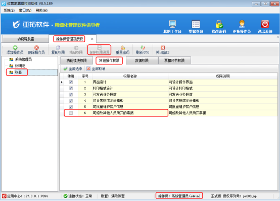 系統管理員登錄軟件后,在功能導航窗點擊“系統管理”——》“操作員及授權”即可打開“操作員管理及授權”界面,以操作員“張亞”為例,選中操作員“張亞”后,點擊“其他操作權限”,去掉勾選“可修改其他人員所開的票據”參數,然后點擊“保存權限設置”按鈕,如圖1所示。