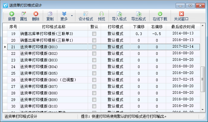 亞拓管理軟件、紅管家倉庫管理軟件、紅管家送貨單軟件、紅管家出納記賬軟件等軟件內(nèi)都支持自定義打印格式模版,可以更方便、靈活的定制打印輸出內(nèi)容和格式,有時我們在打印一類單據(jù)時可能會用到多個打印格式模版,其中一個打印格式模版為常用的,其他的為不常用的打印樣式,此時我們可以將常用的打印格式模版設置為默認,設置為默認打印格式模版后打印單據(jù)時可以使用此默認打印格式模版進行快速打印。