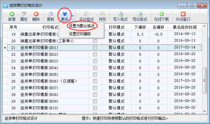 本篇文章以紅管家送貨單軟件為例介紹一下使用多個打印格式模版時如何將其中一個打印模版設置為默認打印格式模版,打開一個已保存的送貨單,在工具欄點擊“打印”—》“打印格式設計”(圖一)打開“送貨單打印格式設計”窗口(圖二),選擇常用的打印格式模版,然后在工具欄點擊“更多”—》“設置為默認格式”(圖三)可以將當前打印格式模版設置為默認打印格式,如下圖四所示。