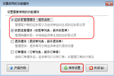 點擊“設置啟用的功能模塊”按鈕,系統(tǒng)彈出“設置啟用的功能模塊”窗口,如圖2所示,一共分為四個功能模塊組:應收款管理模塊、收款結(jié)算模塊、退貨模塊、訂單模塊。軟件默認顯示全部的功能模塊,現(xiàn)在我們只勾選應收款管理模塊和收款結(jié)算模塊,取消勾選退貨模塊和訂單模塊,然后點擊“保存設置”按鈕。