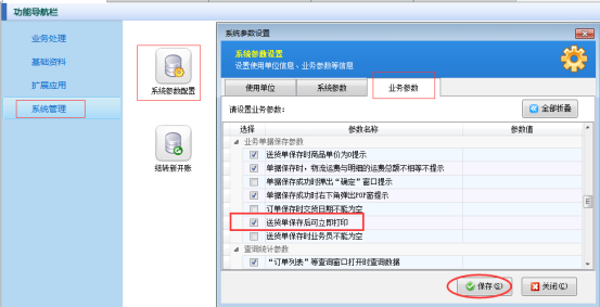 功能導(dǎo)航欄選擇“系統(tǒng)管理”—》“系統(tǒng)參數(shù)配置”—》“業(yè)務(wù)參數(shù)”,勾選上“送貨單保存后可立即打印”,配置完成后點(diǎn)擊“保存”按鈕保存配置,如下圖1所示: