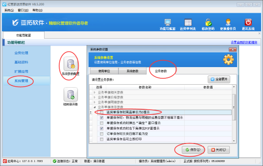 在功能導航窗點擊“系統管理”—》“系統參數配置”—》“業務參數”,即可進入到“業務參數”配置界面,在業務單據保存參數內找到“送貨單保存時商品單價為0提示”參數,把這個參數的勾選去掉,然后保存,如下圖二所示。