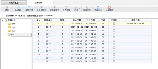 在功能導航窗點擊“財務處理”—“期末結賬”,系統可以打開期末結賬界面。