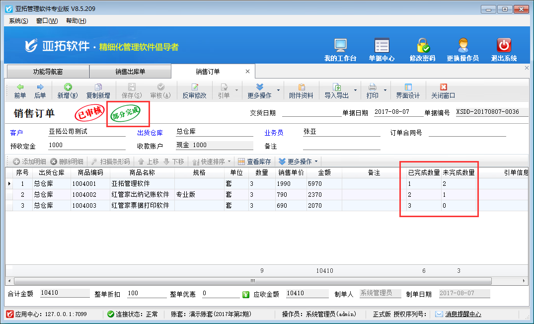 銷售出庫單開單時軟件支持引用銷售訂單進(jìn)行發(fā)貨出庫,保存并審核銷售出庫單后,軟件會自動更新相應(yīng)銷售訂單的單據(jù)明細(xì)中每個商品的執(zhí)行數(shù)量。如果至少一個明細(xì)的執(zhí)行數(shù)量小于訂單數(shù)量,則表示銷售訂單還沒有完全執(zhí)行,軟件標(biāo)記該銷售訂單的執(zhí)行狀態(tài)為“部分完成”。
