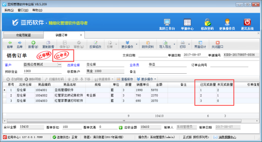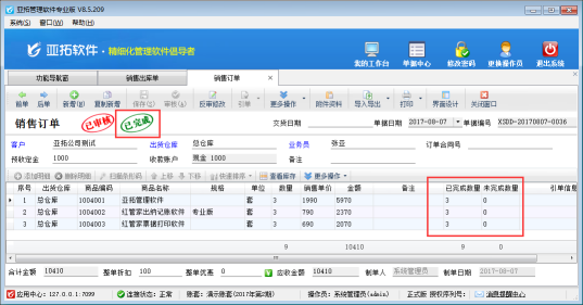銷售出庫單引用銷售訂單,保存并審核銷售出庫單后,軟件會自動更新相應(yīng)銷售訂單的單據(jù)明細(xì)中每個商品的執(zhí)行數(shù)量。如果每個明細(xì)的執(zhí)行數(shù)量大于或等于訂單數(shù)量,則表示該銷售訂單已經(jīng)執(zhí)行完畢,軟件標(biāo)記該銷售訂單的執(zhí)行狀態(tài)為“已完成”。
