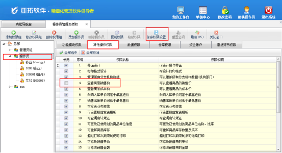 亞拓管理軟件支持設置不同的操作員進行登錄軟件,有的客戶需要操作員開單不允許看到銷售價格,軟件支持在操作員權限及授權中設置操作員不能查看銷售價格。
