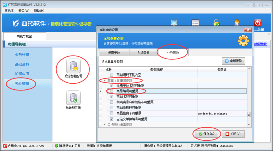 以紅管家送貨單軟件為例,在系統(tǒng)管理—》系統(tǒng)參數(shù)配置—》業(yè)務(wù)參數(shù)內(nèi)將“數(shù)據(jù)可否重復(fù)參數(shù)”中的“商品編碼可重復(fù)”參數(shù)的勾選取消,然后保存設(shè)置。如下圖所示: