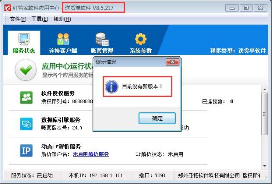 本文我們以紅管家送貨單軟件為例,截止到本文發(fā)布日期,紅管家送貨單軟件最新版是V8.5.217版本,我們以V8.5.210版本為例介紹下軟件聯(lián)網(wǎng)檢查最新版的兩種方法。