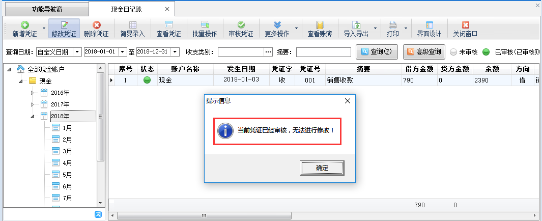 紅管家出納記賬軟件中憑證審核后,不允許直接修改(如下圖一所示)。但是部分客戶需要對(duì)已審核的憑證進(jìn)行修改,軟件支持反審修改憑證功能。本篇文章我們介紹一下紅管家出納記賬軟件中如何反審日記賬憑證?